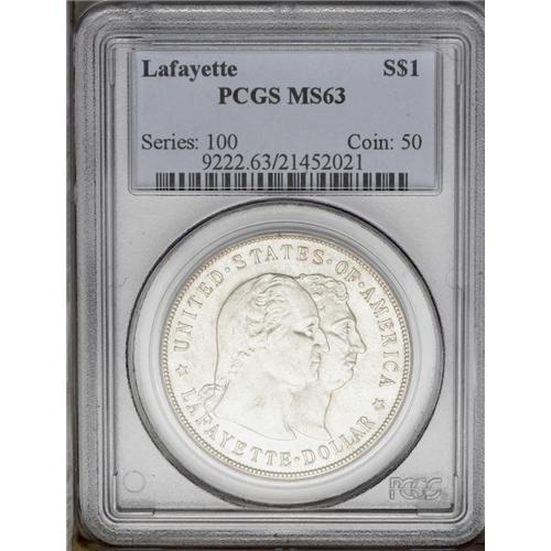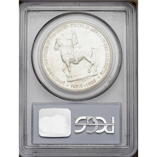 <B>1900<img border='0' src='http://www.heritagecoins.com/images/star.gif' width=10 height=10>$1> Lafayette Dollar MS63 PCGS.</B></I> DuVall 1-B. Well struck with nearly untoned silver-gray surfaces that display typical satiny luster. The only noticeable defect is a curved pinscratch that extends from between G and E, near the right reverse rim, across the horse's tail.
