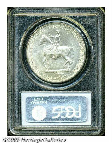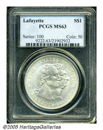 <B>1900<S$1> Lafayette Dollar MS63 PCGS.</B></I> DuVall 2-C. The nearly untoned surfaces reveal a frosty-like texture and emit nice luster, and the design elements are sharply struck throughout. A few minute marks are seen on Washington's cheek and neck
