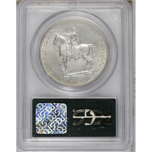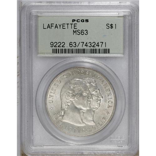 <B>1900<img border='0' src='http://www.heritagecoins.com/images/star.gif' width=10 height=10>$1> Lafayette Dollar MS63 PCGS.</B></I> DuVall 1-B. Select and solidly struck with soft luster beneath silver-gray patina. Numerous abrasions appear on the coin, including some on Washington's cheek, one on Lafayette's neck, and several in the fields. Housed in a green label holder.