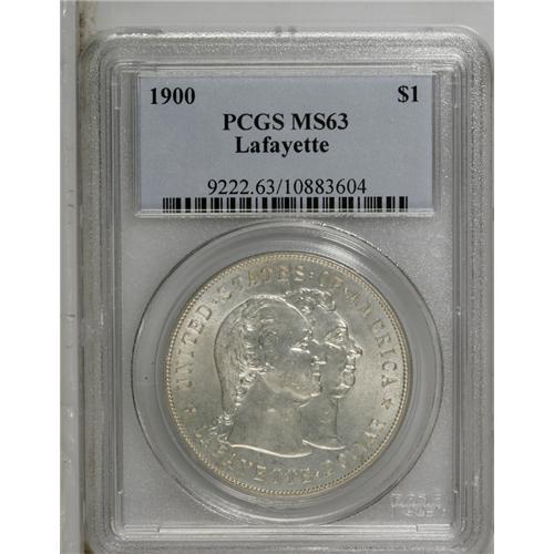 <B>1900 S$1 Lafayette Dollar MS63 PCGS.</B></I> DuVall 2-C. Typically struck and softly lustrous with hints of violet and rose toning on each side. The busts of Washington and Lafayette have various small marks, likely due to the Mint's carelessness in handling this issue.<BR><BR><b>Shipping:</b> Coin/Currency (<a target="_blank" href="http://www.heritageauctions.com/common/shipping.php">view shipping information</a>)
