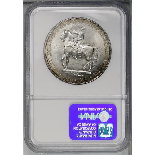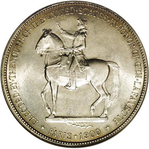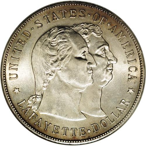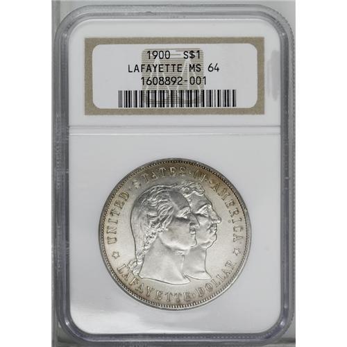<B>1900<img border='0' src='http://www.heritagecoins.com/images/star.gif' width=10 height=10>$1> Lafayette Dollar MS64 NGC.</B></I> DuVall 2-C. Both sides are largely untoned with some soft golden peripheral color and a bold strike. There are a few mentionable abrasions over the obverse portraits and in the reverse fields. The Lafayette dollar is one of the key issues in the U.S. Commemorative series, with near-Gems being undeniably scarce. <BR><BR><B>Important notice:</B> Heritage usually auctions material at the rate of 200-250 lots per hour. On some occasions eBay Live bid software or the Internet may not be able to keep up with the pace of the auction. We recommend placing a realistic absentee bid now as insurance to avoid disappointment. Occasionally the auctioneer may eliminate or reject an eBay Live bid, and the auctioneer may also reopen a lot after the close of the eBay live bidding (usually because we missed an audience bid), and may reject your bid even if it shows you as the winning bidder. By bidding via eBay Live, you agree that Heritage may award the lot to another bidder at its sole discretion under the circumstances described above or any other reasonable circumstances. Since eBay bids are not shown to us until we open the lot on the floor, we treat those bids just like floor bids. In most cases the floor responds before the eBay bid is presented to us, due to Internet lag time, so for consistency we have made it a policy that floor bids are always considered first over tie eBay live bids. Also please note that all Heritage lots purchased through eBay Live carry a 20% Buyer's Premium. Please make sure you read the Terms and Conditions before you bid. This lot is being auctioned in conjunction with a live floor auction by Heritage Galleries & Auctioneers. All final auction and invoice information will be supplied by Heritage Galleries & Auctioneers, and all other information should be considered preliminary. Lot:4835 <BR><BR><B>Winning Notification and Billing:</B> After the FINAL session in this auction is complete, Heritage will send e-mail and snail mail invoices. This process normally takes several days. All final auction and invoice information will be supplied by Heritage Galleries & Auctioneers, and all other information should be considered preliminary. <BR><BR>This auction will be conducted on a live auction floor and over the Internet through eBay Live. If you choose to place an absentee bid, please take a moment to <font color='#0000ff'><u><a href='http://pages.ebay.com/liveauctions/help/before/laabsentee.html'>learn how eBay Live absentee bidding works</a></u></font><font color='#000000'>