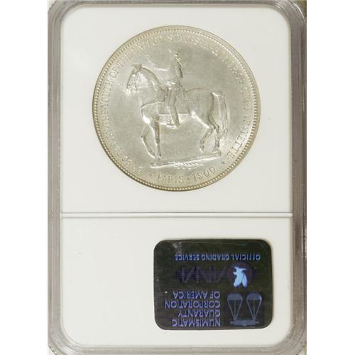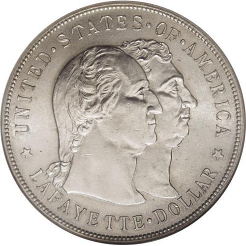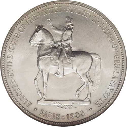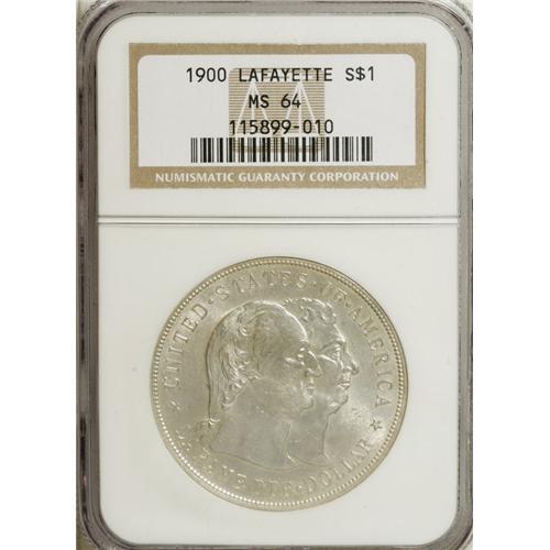 <B>1900 S$1 Lafayette Dollar MS64 NGC.</B></I> DuVall 1-B. As the only silver dollar among the classic commemoratives, the Lafayette enjoys continual popularity. This near-Gem displays surprisingly little patina, with only traces of gold-gray at the margins and silver-gray over the rest of the coin. Well struck with only a few grade-limiting marks on the conjoined portraits and in the surrounding fields.<BR><BR><b>Shipping:</b> Coins & Currency (<a target="_blank" href="http://www.heritageauctions.com/common/shipping.php">view shipping information</a>)