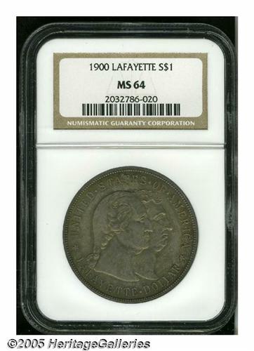 <B>1900<S$1> Lafayette Dollar MS64 NGC.</B></I> DuVall 1-B. Deeply toned with grayish-brown color accented by delightful rainbow iridescence. This is a fully natural and original appearing example, and should be affordable for a variety of collectors who may be on a more limited budget.<BR><I>From the Dr. Kurt Peters Collection.</B></I> From the Dr. Kurt Peters Collection.