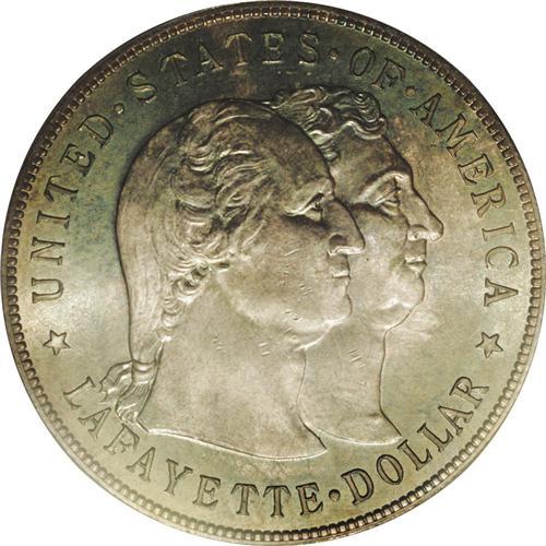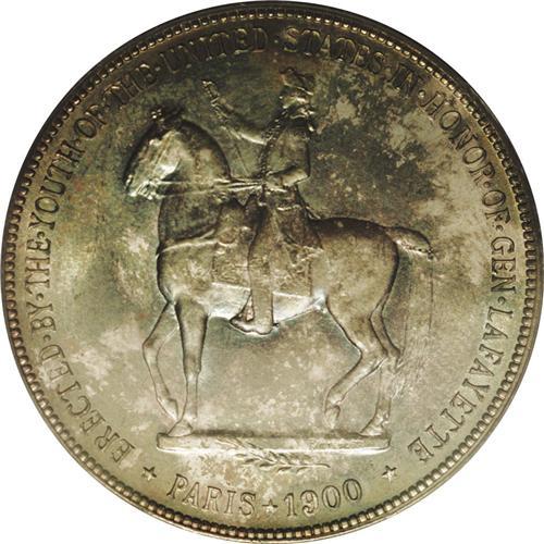 <B>1900<img border='0' src='http://www.heritagecoins.com/images/star.gif' width=10 height=10>$1> Lafayette Dollar MS64 PCGS.</B></I> DuVall 1-B. Dimes were collected by the thousands from the school children of America in the late 1890s to erect the depicted statue of General Lafayette. Q. David Bowers states the statue is located at the entrance to the Tuilleries Gardens in Paris. However, the present writer (MVW) has searched in vain on several occasions for this statue. If anyone knows the exact location, please contact me. This piece, unlike many of its ilk, is especially lustrous. Both sides are typically toned with sea-green, pinkish-gray, and golden coloration. A few tiny marks on the face of Washington keep this coin in the MS64 category.