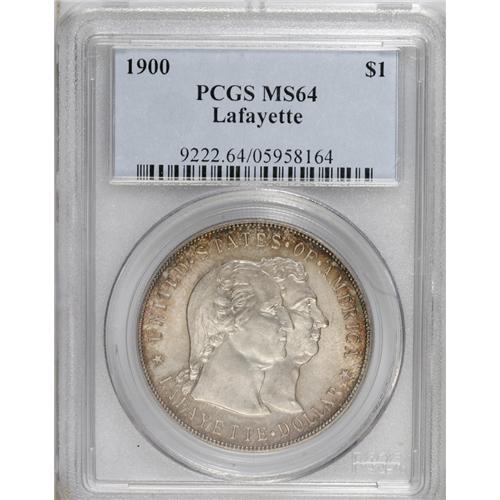<B>1900 S$1 Lafayette Dollar MS64 PCGS.</B></I> DuVall 1-B. A band of autumn-brown embraces the obverse border, but the portraits and the reverse are only lightly toned. This lustrous and intricately struck near-Gem is decidedly above average for the type, which is often encountered lackluster or with numerous marks on Washington.<BR><BR><b>Shipping:</b> Coins & Currency (<a target="_blank" href="http://www.heritageauctions.com/common/shipping.php">view shipping information</a>)