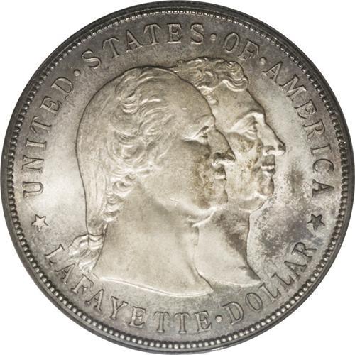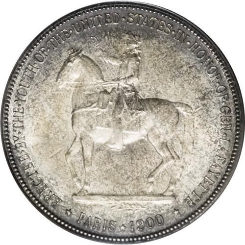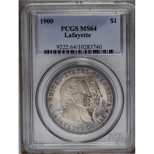<B>1900<img border='0' src='http://www.heritagecoins.com/images/star.gif' width=10 height=10>$1> Lafayette Dollar MS64 PCGS.</B></I> DuVall 1-B. Another Choice representative of this significant early commemorative, the example offered here is well struck beneath splotchy gunmetal and olive toning. The only noticeable abrasions are found on the dual portraits of Washington and Lafayette.