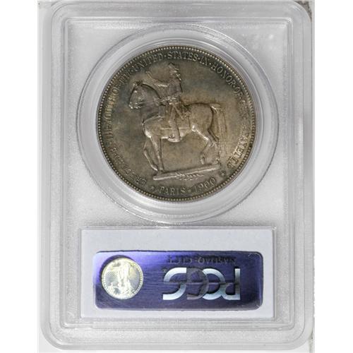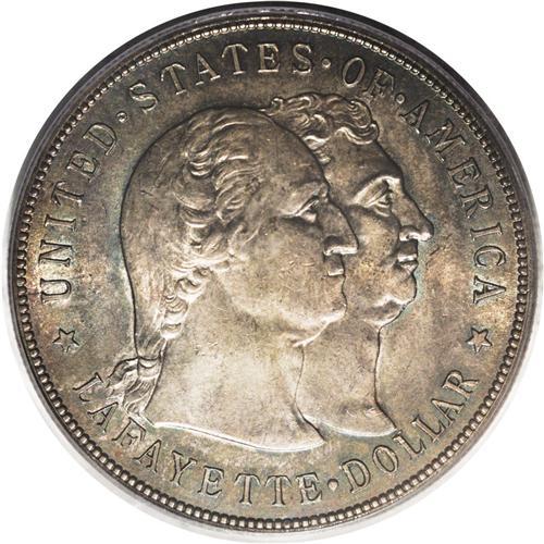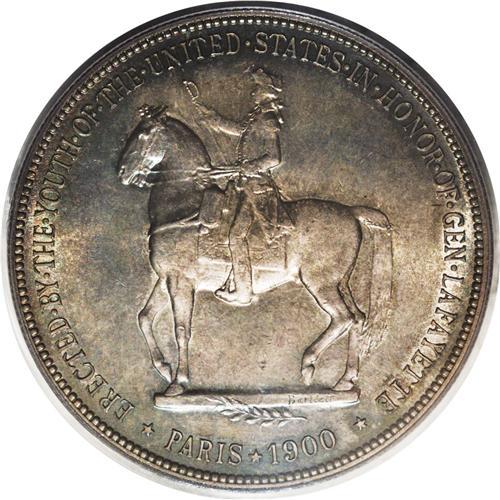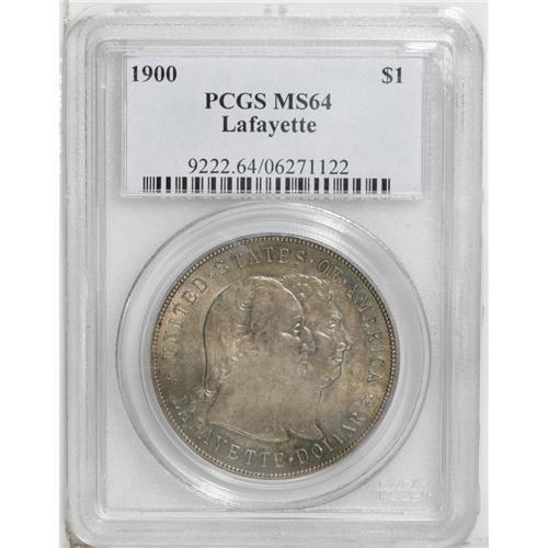 <B>1900<img border='0' src='http://www.heritagecoins.com/images/star.gif' width=10 height=10>$1> Lafayette Dollar MS64 PCGS.</B></I> DuVall 1-B. Appealingly toned in gray-gold, mint-green, and rose-tinged patina, this near-Gem example radiates brilliant luster underneath the light toning. Although a few light ticks on Washington's cheek and neck limit a higher grade, the reverse is particularly pristine, surprisingly so, since the exposed fields around the statue of General Lafayette act as a magnet for surface impairments. This attractive coin is much nicer than the "typical" Lafayette seen in this grade.
