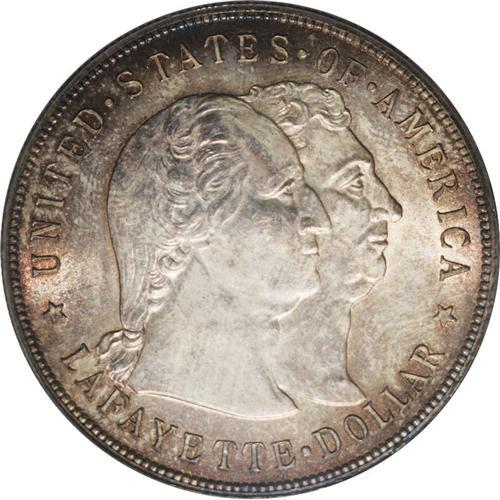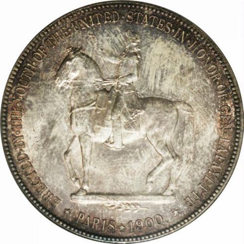 <B>1900<img border='0' src='http://www.heritagecoins.com/images/star.gif' width=10 height=10>$1> Lafayette Dollar MS64 PCGS.</B></I> DuVall 1-B. Deep sunset-red and mauve-gray colors alternate across this satiny and crisply struck near-Gem. Careful examination of the surfaces beneath the rich colors does not reveal any contact worthy of mention. The obverse is particularly undisturbed. Although dated 1900, all Lafayette Dollars were in fact struck on the 100th anniversary of George Washington's death in December 1899.
