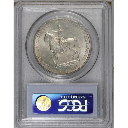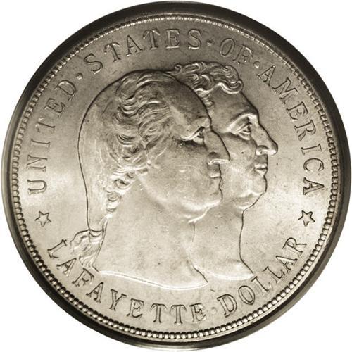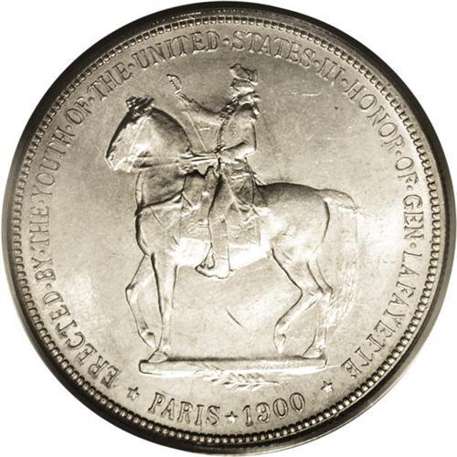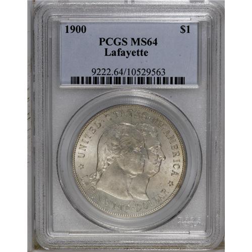 <B>1900<img border='0' src='http://www.heritagecoins.com/images/star.gif' width=10 height=10>$1> Lafayette Dollar MS64 PCGS.</B></I> DuVall 1-B. On this DuVall variety, the A in DOLLAR leans left, and is much lower than nearby letters. A few light scrapes, typically found on Washington's cheek, define the grade, but subtle radiance emanates from each side of this pretty silver-gold piece, and there are no particular impairments. Good eye appeal for the grade.