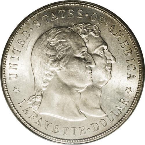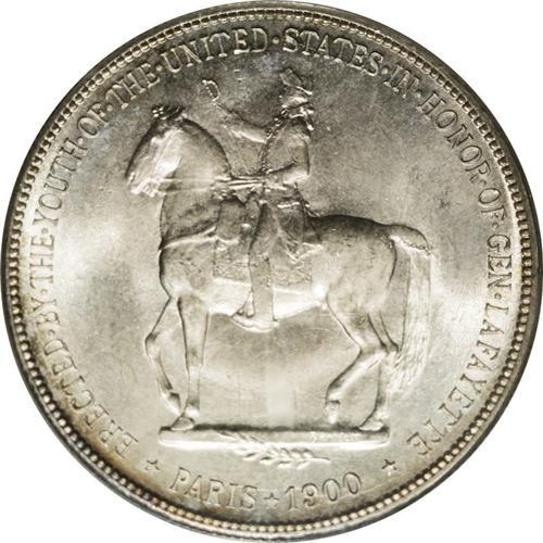 <B>1900<img border='0' src='http://www.heritagecoins.com/images/star.gif' width=10 height=10>$1> Lafayette Dollar MS64 PCGS.</B></I> DuVall 1-B. This sharply struck example has pleasing luster and light tan-gold peripheral toning. A few light to moderate marks on Washington's cheek determine the grade. Housed in a green label holder. For the Lafayette Dollar, the verbose peripheral legends were not hubbed, but instead entered by hand onto the working die. The olive branch beneath the statue is differently shaped and varies in placement for each of the four reverse dies used. Perhaps the mint was in a hurry to strike the issue on the exact centennial of Washington's birth, December 14, 1899.