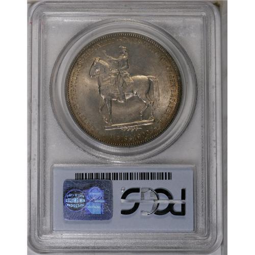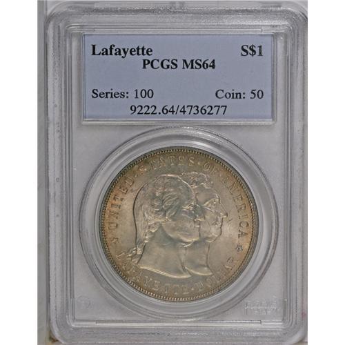 <B>1900<img border='0' src='http://www.heritagecoins.com/images/star.gif' width=10 height=10>$1> Lafayette Dollar MS64 PCGS.</B></I> DuVall 1-B. This original and appealing example has silver centers that meld into pretty amber-gold and copper hues at the rims on each side. Radiant cartwheel luster emanates from the frosty surfaces. The few surface abrasions noted are light, undistracting, and grade-consistent. A nice piece that would work well in a Gem commemorative set with no apology required.
