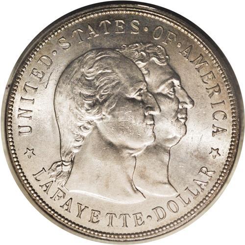 <B>1900<img border='0' src='http://www.heritagecoins.com/images/star.gif' width=10 height=10>$1> Lafayette Dollar MS64 PCGS.</B></I> DuVall 1-B. This sharply struck example has pleasing luster and light tan-gold peripheral toning. A few light to moderate marks on Washington's cheek determine the grade. Housed in a green label holder. For the Lafayette dollar, the verbose peripheral legends were not hubbed, but instead entered by hand onto the working die. The olive branch beneath the statue is differently shaped and varies in placement for each of the four reverse dies used. Certified in a green-label holder.