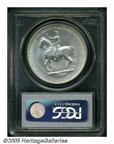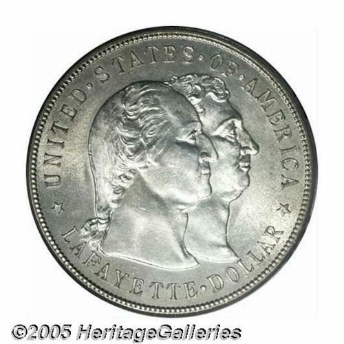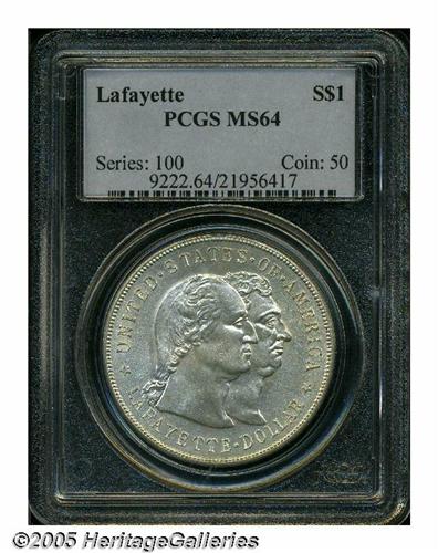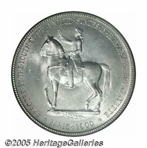 <B>1900<S$1> Lafayette Dollar MS64 PCGS.</B></I> DuVall 1-B. This is one of few post-dated commemorative issues, having been struck in December 1899, despite the 1900 date that is born on the physical coin. It is a sharply struck example, even including some detail in Lafayette's boot, an area that is often completely obliterated. The surfaces have full frosty luster with a completely untoned finish overall.