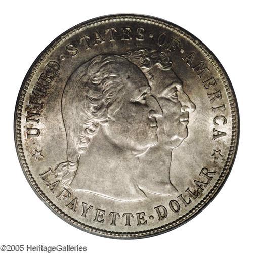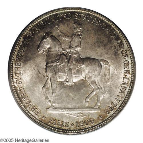 <B>1900<S$1> Lafayette Dollar MS64 PCGS.</B></I> DuVall 2-C. Lavender and golden-gray colors embrace this lustrous and crisply struck near-Gem. Thorough study locates a couple of unimportant marks near Washington's jaw, but overall, unusually clean for this conditionally scarce early Commemorative type.