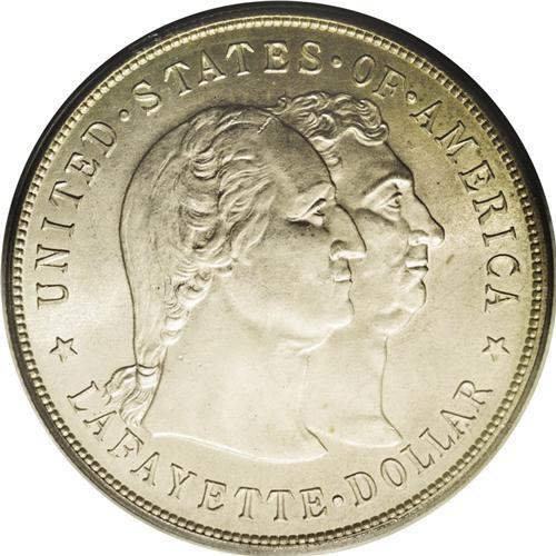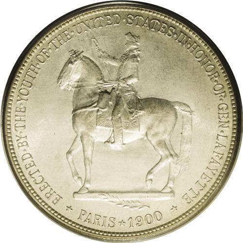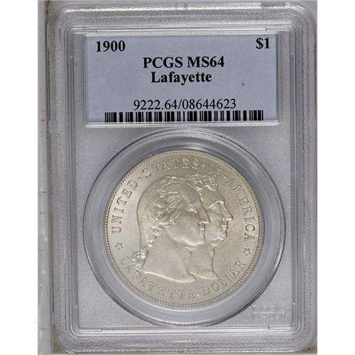 <B>1900<img border='0' src='http://www.heritagecoins.com/images/star.gif' width=10 height=10>$1> Lafayette Dollar MS64 PCGS.</B></I> DuVall 2-C. Sharply defined for this popular early commemorative and virtually untoned, save for a hint of reddish-golden patina on each side that provides soft eye appeal. The reverse is virtually unmarked and truly superb, while a couple of minor abrasions are noted on Washington's cheek.