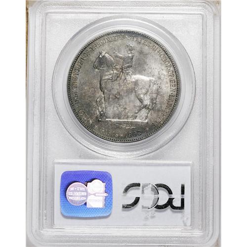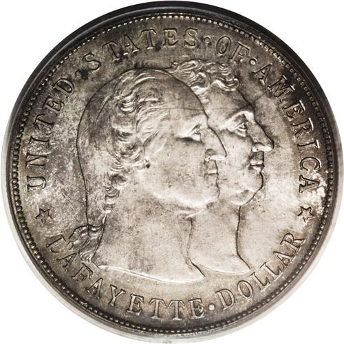 <B>1900<img border='0' src='http://www.heritagecoins.com/images/star.gif' width=10 height=10>$1> Lafayette Dollar MS64 PCGS.</B></I> DuVall 2-C. The second S in STATES is boldly recut on this interesting die pairing. The final A in AMERICA is also recut on its left upright and stand. The only commemorative silver dollar issued prior to 1983, the Lafayette dollar is also notable for its portrait of George Washington, who makes the first of several appearances on commemorative issues. This satiny and sharply struck near-Gem has intermingled sea-green, charcoal-gray, and gunmetal-gray patina. An original and carefully preserved example.