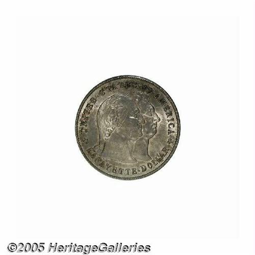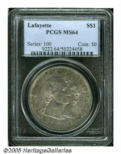 <B>1900<S$1> Lafayette Dollar MS64 PCGS.</B></I> DuVall 2-C. Lavender and golden-gray colors embrace this lustrous and crisply struck near-Gem. Thorough study locates a couple of unimportant marks near Washington's jaw, but overall, unusually clean for this conditionally scarce early Commemorative type.