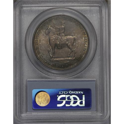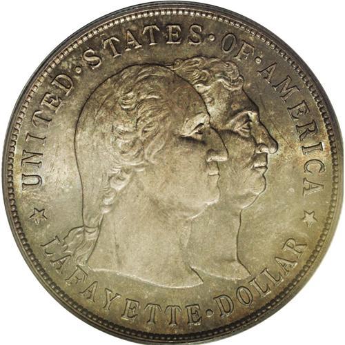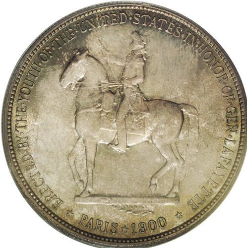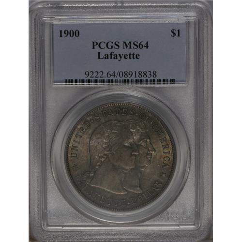<B>1900<img border='0' src='http://www.heritagecoins.com/images/star.gif' width=10 height=10>$1> Lafayette Dollar MS64 PCGS.</B></I> DuVall-2C. Well struck with vibrant luster and a coating of dappled patina over both sides, including multiple shades of gray, gold, green, and red. A few scattered marks prevent a higher grade.