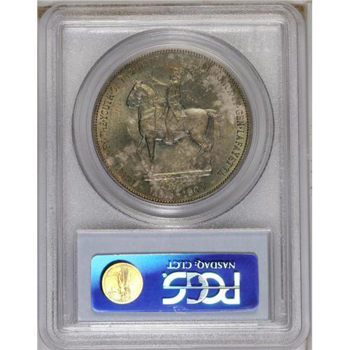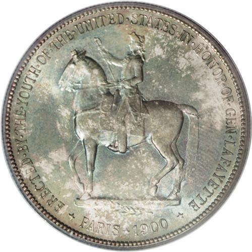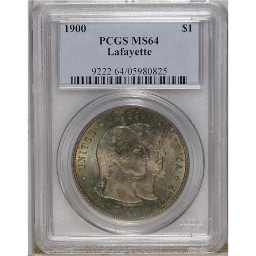 <B>1900 S$1 Lafayette Dollar MS64 PCGS.</B></I> DuVall 1-B. Well struck with shimmering satiny luster and lovely lime-green, peach, and rose-gray toning over both sides. The reverse is nearly untouched, while the obverse shows a handful of small, yet grade-limiting abrasions. This early issue was the first commemorative coin of the one dollar denomination.<BR><BR><b>Shipping:</b> Coins & Currency (<a target="_blank" href="http://www.heritageauctions.com/common/shipping.php">view shipping information</a>)