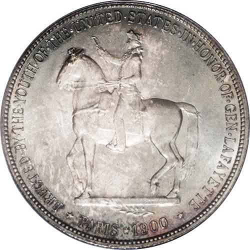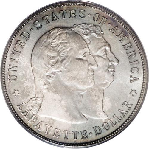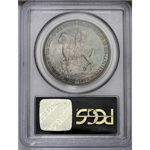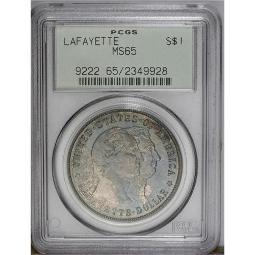 <B>1900<img border='0' src='http://www.heritagecoins.com/images/star.gif' width=10 height=10>$1> Lafayette Dollar MS65 PCGS.</B></I> DuVall 2-C. The obverse is identified by a doubled final S in STATES, and a pellet that is centered between OF and AMERICA. On the reverse, the branch has a short and heavy stem. Variegated aqua-blue and beige-mauve toning bathes lustrous surfaces. The design elements are well impressed. The only visible marks occur on Washington's cheek and forehead, and are not worthy of individual description. An overall pleasing Lafayette dollar. <BR><BR><B>Important notice:</B> Heritage usually auctions material at the rate of 200-250 lots per hour. On some occasions eBay Live bid software or the Internet may not be able to keep up with the pace of the auction. We recommend placing a realistic absentee bid now as insurance to avoid disappointment. Occasionally the auctioneer may eliminate or reject an eBay Live bid, and the auctioneer may also reopen a lot after the close of the eBay live bidding (usually because we missed an audience bid), and may reject your bid even if it shows you as the winning bidder. By bidding via eBay Live, you agree that Heritage may award the lot to another bidder at its sole discretion under the circumstances described above or any other reasonable circumstances. Since eBay bids are not shown to us until we open the lot on the floor, we treat those bids just like floor bids. In most cases the floor responds before the eBay bid is presented to us, due to Internet lag time, so for consistency we have made it a policy that floor bids are always considered first over tie eBay live bids. Also please note that all Heritage lots purchased through eBay Live carry a 20% Buyer's Premium. Please make sure you read the Terms and Conditions before you bid. This lot is being auctioned in conjunction with a live floor auction by Heritage Galleries & Auctioneers. All final auction and invoice information will be supplied by Heritage Galleries & Auctioneers, and all other information should be considered preliminary. Lot:4838 <BR><BR><B>Winning Notification and Billing:</B> After the FINAL session in this auction is complete, Heritage will send e-mail and snail mail invoices. This process normally takes several days. All final auction and invoice information will be supplied by Heritage Galleries & Auctioneers, and all other information should be considered preliminary. <BR><BR>This auction will be conducted on a live auction floor and over the Internet through eBay Live. If you choose to place an absentee bid, please take a moment to <font color='#0000ff'><u><a href='http://pages.ebay.com/liveauctions/help/before/laabsentee.html'>learn how eBay Live absentee bidding works</a></u></font><font color='#000000'>