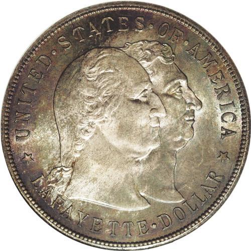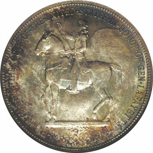 <B>1900<img border='0' src='http://www.heritagecoins.com/images/star.gif' width=10 height=10>$1> Lafayette Dollar MS66 NGC.</B></I> DuVall 1-B. Dappled cream-gray and apple-green toning is lightened by infrequent hints of lime, fire-red, and golden-brown. This lustrous and precisely struck Premium Gem is close to immaculate, since the few minuscule ticks seen on the centers were likely present on the planchet prior to the strike. The Lafayette dollar is sometimes referred to as a dateless commemorative. The entire mintage was produced on the exact centennial of Washington's death, December 14, 1899. This date is not part of the design, and the 1900 within the reverse legend refers to the scheduled ceremony to unveil a Lafayette statue in Paris, France. This statue, depicted on the reverse, was partially funded by American schoolchildren. Census: 59 in 66, 8 finer (4/06).