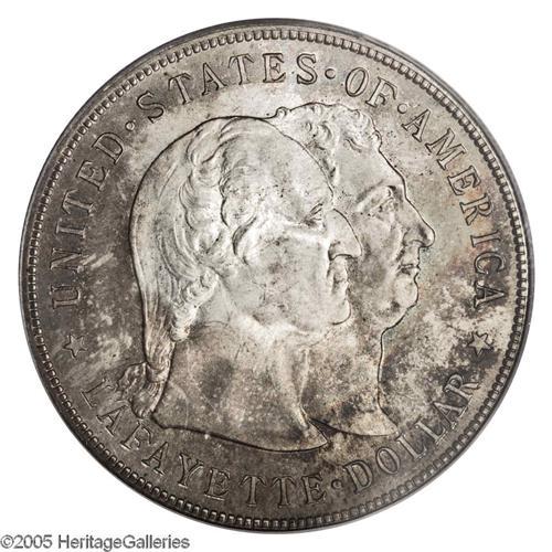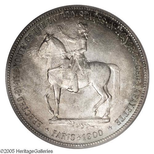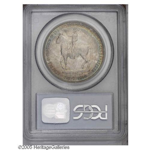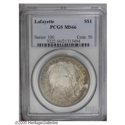 <B>1900<S$1> Lafayette Dollar MS66 PCGS.</B></I> DuVall 1-B. The only die marriage which has the lowest right leaf on the laurel branch pointing between the 19 in the date. Rich emerald-green, gray, golden, and ruby-red colors endow the obverse and reverse, although slightly more color is seen on the reverse. The statue was partially financed through the contributions of American schoolchildren, hence the reverse legend "ERECTED BY THE YOUTH OF THE UNITED STATES." A satiny, crisply struck, and well preserved Gem of this sole Silver Dollar Commemorative issue from the 'classic' 1892-1954 series. Population: 83 in 66, 5 finer (11/05).