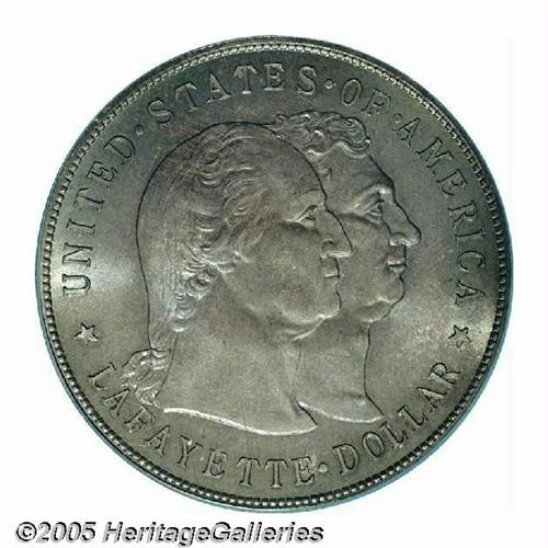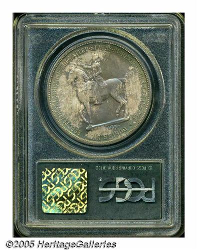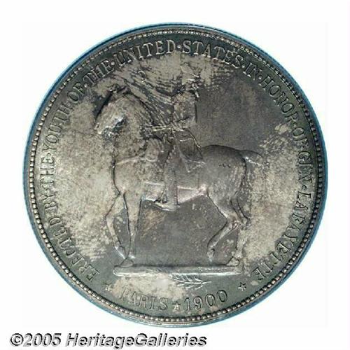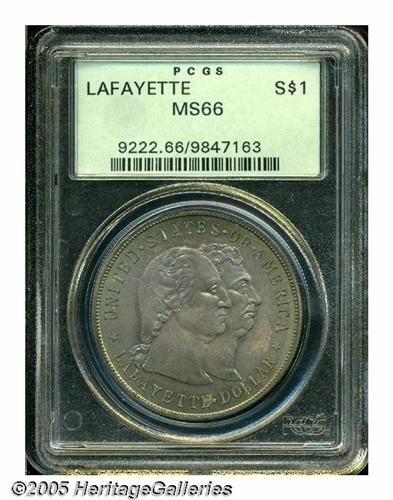<B>1900<S$1> Lafayette Dollar MS66 PCGS.</B></I> DuVall 3-D. The second T in STATES is repunched at the bottom. The T in UNITED, A in STATES, and E in AMERICA also show evidence of repunching. This is an absolutely stunning and splendid Premium Gem example of the issue with deep magenta and pale blue color, accented by light yellow at the borders. Examples of this quality are seldom encountered, and you can practically forget about a finer coin. PCGS has only certified five coins at higher grades, and those are almost certainly all off the market. Population: 84 in 66, 5 finer (5/05).