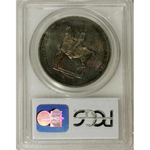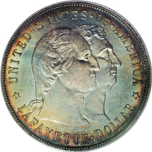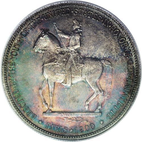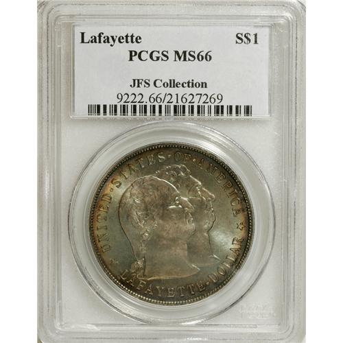 <B>1900 S$1 Lafayette Dollar MS66 PCGS.</B></I> Ex: JFS Collection. DuVall 2-C. The second S in STATES is repunched, as is the final A in AMERICA. All Lafayette dollars were struck on December 14, 1899, the hundredth anniversary of George Washington's death, and numismatic scholars speculate that the inconsistencies between Lafayette dollar dies are indicative of hasty work. The slipshod production of the dollars themselves lends credence to the hypothesis.<BR> The obverse of this enticing dollar has hints of orange and reddish-brown at the margins and a blue-green center, while the reverse displays variegated peach, magenta, aquamarine, cerulean, and cyan toning. Each side exhibits potent luster beneath the rich patina, and the focal areas are surprisingly clean. PCGS has certified a mere five coins finer (3/07).<BR><I>From The Cary & Cheryl Porter Collection.</B></I><BR><BR><b>Shipping:</b> Coins & Currency (<a target="_blank" href="http://www.heritageauctions.com/common/shipping.php">view shipping information</a>)