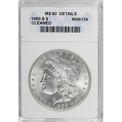 <B>1900-S $1 --Cleaned--ANACS. MS60 Details.</B></I> NGC Census: (12/1885). PCGS Population (31/3499). Mintage: 3,540,000. Numismedia Wsl. Price for NGC/PCGS coin in MS60: $242. (#7270)<BR><BR><B>Coin Engraver:</B> George T. Morgan<BR><BR><b>Shipping:</b> Coins & Currency (<a target="_blank" href="http://www.heritageauctions.com/common/shipping.php">view shipping information</a>)