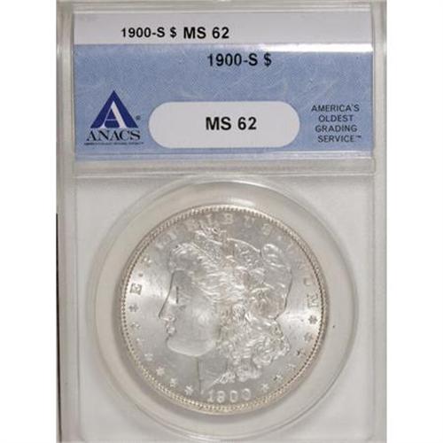 <B>1900-S $1 MS62 ANACS.</B></I> NGC Census: (276/1591). PCGS Population (427/3077). Mintage: 3,540,000. Numismedia Wsl. Price for NGC/PCGS coin in MS62: $285. (#7270)<BR><BR><B>Coin Engraver:</B> George T. Morgan<BR><BR><b>Shipping:</b> Coins & Currency (<a target="_blank" href="http://www.heritageauctions.com/common/shipping.php">view shipping information</a>)