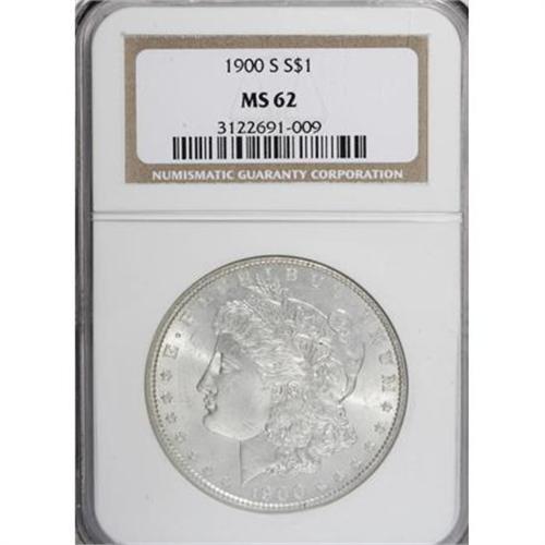 <B>1900-S $1 MS62 NGC.</B></I> NGC Census: (273/1581). PCGS Population (426/3057). Mintage: 3,540,000. Numismedia Wsl. Price for NGC/PCGS coin in MS62: $285. (#7270)<BR><BR><B>Coin Engraver:</B> George T. Morgan<BR><BR><b>Shipping:</b> Coins & Currency (<a target="_blank" href="http://www.heritageauctions.com/common/shipping.php">view shipping information</a>)