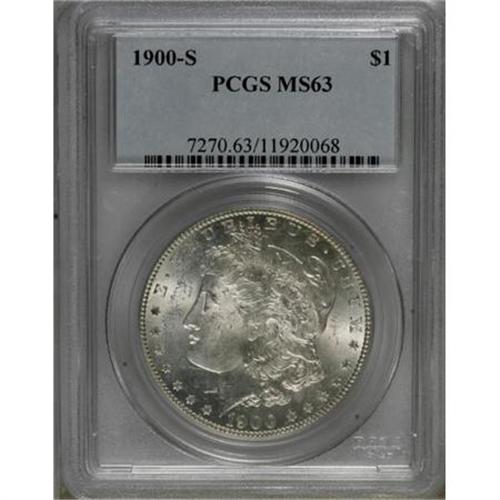 <B>1900-S $1 MS63 PCGS.</B></I> PCGS Population (1218/1872). NGC Census: (658/939). Mintage: 3,540,000. Numismedia Wsl. Price for NGC/PCGS coin in MS63: $325. (#7270)<BR><BR><B>Coin Engraver:</B> George T. Morgan<BR><BR><b>Shipping:</b> Coins & Currency (<a target="_blank" href="http://www.heritageauctions.com/common/shipping.php">view shipping information</a>)