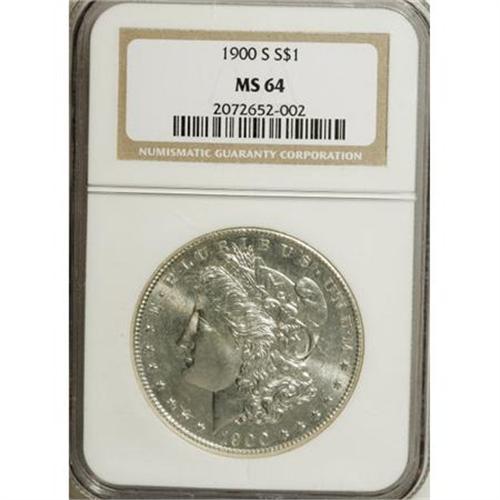 <B>1900-S $1 MS64 NGC.</B></I> NGC Census: (739/169). PCGS Population (1239/513). Mintage: 3,540,000. Numismedia Wsl. Price for NGC/PCGS coin in MS64: $400. (#7270)<BR><BR><b>Shipping:</b> Coins & Currency (<a target="_blank" href="http://www.heritageauctions.com/common/shipping.php">view shipping information</a>)