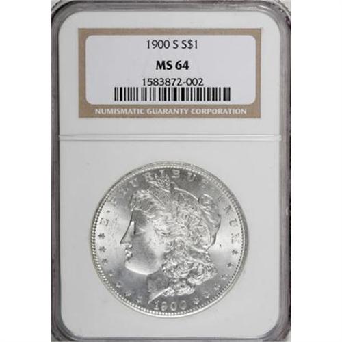 <B>1900-S $1 MS64 NGC.</B></I> Sharply struck and brilliant throughout. A minimally abraded near-Gem example of this popular, late-date San Francisco dollar.<BR><BR><B>Coin Engraver:</B> George T. Morgan<BR><BR><b>Shipping:</b> Coins & Currency (<a target="_blank" href="http://www.heritageauctions.com/common/shipping.php">view shipping information</a>)
