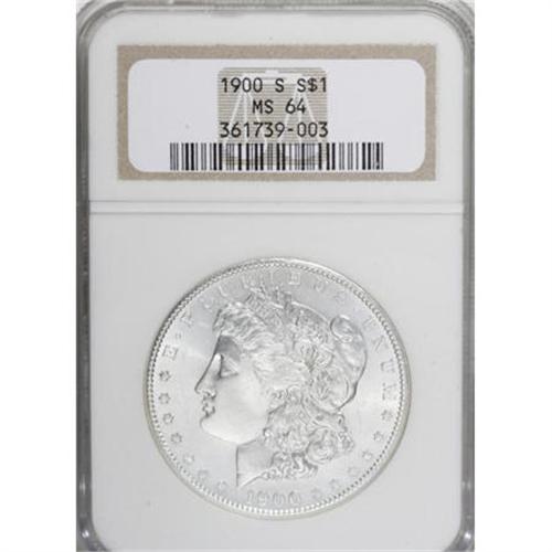 <B>1900-S $1 MS64 NGC.</B></I> . .. NGC Census: (761/169). PCGS Population (1300/549). Mintage: 3,540,000. Numismedia Wsl. Price for NGC/PCGS coin in MS64: $440. (#7270)<BR><BR><B>Coin Engraver:</B> George T. Morgan<BR><BR><b>Shipping:</b> Coins & Currency (<a target="_blank" href="http://www.heritageauctions.com/common/shipping.php">view shipping information</a>)