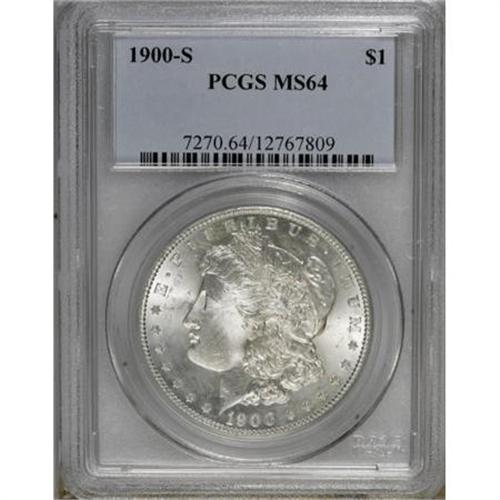 <B>1900-S $1 MS64 PCGS.</B></I> PCGS Population (1313/551). NGC Census: (762/170). Mintage: 3,540,000. Numismedia Wsl. Price for NGC/PCGS coin in MS64: $460. (#7270)<BR><BR><B>Coin Engraver:</B> George T. Morgan<BR><BR><b>Shipping:</b> Coins & Currency (<a target="_blank" href="http://www.heritageauctions.com/common/shipping.php">view shipping information</a>)
