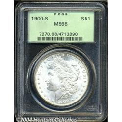 <table><tbody><tr><td><table> <TR><TD width="100%"><TABLE cellSpacing=1 cellPadding=3 width="100%" border=0><TBODY><TR><TD width="100%" bgColor=#79735c><FONT face=arial color=#ffffff size=3><B>Description</B> </FONT></TD></TR><TR><TD width="100%" bgColor=#ffffff><FONT face=arial size=2><B>1900-S $1 MS66 PCGS.</B></I> The surfaces on this scarcer turn-of-the-century issue are boldly detailed with soft frosted, satiny luster. There are few appreciable blemishes to distract the viewer and only faint blushes of rose-gray patina are seen on either side. Wispy roller marks angling across the portrait are a product of the minting process and are not even discernible without the aid of magnification.<BR><I>From the Dylan Elijah Collection of Morgan Dollars.</B></I> </FONT></TD></TR></TBODY></TABLE></TD></TR></TBODY></TABLE><BR><A name=PricesRealized></A><TABLE cellSpacing=0 cellPadding=0 width="100%" bgColor=#000000 border=0><TBODY><TR><TD width="100%"><TABLE cellSpacing=1 cellPadding=3 width="100%" border=0><TBODY><TR><TD width="100%" bgColor=#79735c><A name=PR><FONT face=arial color=#ffffff size=3><B>Previous Prices from Heritage Auctions</B> </FONT></A></TD></TR><TR><TD bgColor=#f6f6ed><TABLE cellSpacing=0 cellPadding=0 width="100%" border=1><TBODY><TR><TD align=middle width="33%"><B>Date</B></TD><TD align=middle width="33%"><B>Service</B></TD><TD align=middle width="33%"><B>Price</B></TD></TR><TR bgColor=whitesmoke><TD width="33%"><B>07/17/2001</B></TD><TD width="33%">NGC</TD><TD width="33%">$2,500.00</TD></TR><TR bgColor=whitesmoke><TD width="33%"><B>01/07/2004</B></TD><TD width="33%">PCGS</TD><TD width="33%">$2,875.00</TD></TR><TR bgColor=whitesmoke><TD width="33%"><B>01/11/2003</B></TD><TD width="33%">PCGS</TD><TD width="33%">$4,715.00</TD></TR><TR bgColor=whitesmoke><TD width="33%"><B>01/11/2003</B></TD><TD width="33%">PCGS</TD><TD width="33%">$2,875.00</TD></TR><TR bgColor=whitesmoke><TD width="33%"><B>04/27/2002</B></TD><TD width="33%">PCGS</TD><TD width="33%">$3,680.00</TD></TR><TR bgColor=whitesmoke><TD width="33%"><B>11/15/2001</B></TD><TD width="33%">PCGS</TD><TD width="33%">$3,450.00</TD></TR><TR bgColor=whitesmoke><TD width="33%"><B>05/31/2001</B></TD><TD width="33%">NGC</TD><TD width="33%">$2,070.00</TD></TR><TR bgColor=whitesmoke><TD width="33%"><B>10/06/2000</B></TD><TD width="33%">PCGS</TD><TD width="33%">$2,633.50</TD></TR><TR bgColor=whitesmoke><TD width="33%"><B>08/02/1997</B></TD><TD width="33%">NGC</TD><TD width="33%">$7,475.00</TD></TR><TR bgColor=whitesmoke><TD width="33%"><B>11/01/1998</B></TD><TD width="33%">PCGS</TD><TD width="33%">$3,565.00</TD></TR><TR bgColor=whitesmoke><TD width="33%"><B>01/01/1999</B></TD><TD width="33%">PCGS</TD><TD width="33%">$3,910.00</TD></TR><TR bgColor=whitesmoke><TD width="33%"><B>03/01/1999</B></TD><TD width="33%">PCGS</TD><TD width="33%">$3,680.00</TD></TR><TR bgColor=whitesmoke><TD width="33%"><B>09/01/1999</B></TD><TD width="33%">NGC</TD><TD width="33%">$920.00</TD></TR><TR bgColor=whitesmoke><TD width="33%"><B>03/01/1999</B></TD><TD width="33%">NGC</TD><TD width="33%">$3,048.00</TD></TR><TR bgColor=whitesmoke><TD width="33%"><B>05/01/1999</B></TD><TD width="33%">PCGS</TD><TD width="33%">$3,220.00</TD></TR><TR bgColor=whitesmoke><TD width="33%"><B>02/01/2000</B></TD><TD width="33%">PCGS</TD><TD width="33%">$2,875.00</TD></TR></TBODY></TABLE></TD></TR><TR><TD bgColor=#ffffff><FONT face=arial size=1 ?>PLEASE NOTE: All prices realized reflect the final hammer price PLUS the buyer's premium in auctions that charge a buyer's premium. Each item has a notation at the top of the listing indicating whether that lot included a buyer's premium. Example: A item that sells with a final hammer price of $100 and a 20% buyer's premium will display with a price realized of $120. All information listed is intended to be as accurate as possible, but errors are possible. Please use this guide carefully and inform us of any inaccuracies. </FONT></TD></TR></TBODY></TABLE></TD></TR></TBODY></TABLE><BR><TABLE cellSpacing=0 cellPadding=0 width="100%" bgColor=#000000 border=0><TBODY><TR><TD width="100%"><TABLE cellSpacing=1 cellPadding=3 width="100%" border=0><TBODY><TR><TD width="100%" bgColor=#79735c colSpan=6><FONT face=arial color=#ffffff size=3><B>Price Guide*</B> </FONT></TD></TR><TR bgColor=#f6f6ed><TD align=middle><B>Grade</B> </TD><TD align=middle><B>Coin World<BR>(Trends)</B> </TD><TD align=middle><B>Numismedia<BR>Retail</B> </TD><TD align=middle><B>Numismedia<BR>Wholesale</B> </TD><TD align=middle><B>Coin<BR>Universe</B> </TD><TD align=middle><B>Heritage<BR>Value Index</B> </TD></TR><TR bgColor=#ffffff><TD align=middle>65</TD><TD align=right>$1,500.00</TD><TD align=right>---</TD><TD align=right>$1,040.00</TD><TD align=right>$1,575.00</TD><TD align=right>$1,054.38</TD></TR><TR style="FONT-WEIGHT: bold" bgColor=#cccfdd><TD align=middle>66</TD><TD align=right>$4,500.00</TD><TD align=right>---</TD><TD align=right>$3,125.00</TD><TD align=right>$4,750.00</TD><TD align=right>$2,975.00</TD></TR><TR bgColor=#ffffff><TD align=middle>67</TD><TD align=right>---</TD><TD align=right>---</TD><TD align=right>---</TD><TD align=right>---</TD><TD align=right>$10,350.00</TD></TR><TR bgColor=#ffffff><TD colSpan=6><FONT size=1>*All information listed is intended to be as accurate as possible, but errors are possible. No item may be returned or refused based on this information which is provided as a service to our customers. You should contact each pricing source directly to determine the accuracy of this information. </FONT></TD></TR></TBODY></TABLE></TD></TR></TBODY></TABLE><BR><TABLE cellSpacing=0 cellPadding=0 width="100%" bgColor=#000000 border=0><TBODY><TR><TD width="100%"><TABLE cellSpacing=1 cellPadding=3 width="100%" border=0><TBODY><TR><TD width="100%" bgColor=#79735c><FONT face=arial color=#ffffff size=3><B>Population Guide</B> </FONT></TD></TR><TR bgColor=#ffffff><TD align=middle><!-- Begin Output of Population Grid--><TABLE cellSpacing=0 cellPadding=0 widt