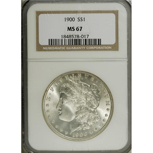 <B>1900 S$1 MS67 NGC.</B></I> An issue seldom found in so high a grade, despite the considerable mintage of almost 9 million pieces. The present piece features excellent luster over brilliant surfaces with just a hint of lilac coloration. This sharply struck piece is remarkably distraction-free. Census: 27 in 67, 0 finer (1/07).<BR><BR><b>Shipping:</b> Coins & Currency (<a target="_blank" href="http://www.heritageauctions.com/common/shipping.php">view shipping information</a>)