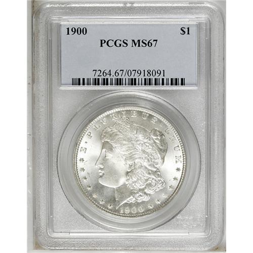 <B>1900 S$1 MS67 PCGS.</B></I> The 1900 is a popular date for type sets, although not a particularly rare or even scarce one in the lower grades of Uncirculated. This is a significant coin in MS67, however, as it represents one of the finest examples available (none have been graded higher). The cheek of Liberty is smooth and rounded with no obvious abrasions there or anywhere else on the coin. Brilliant throughout, this dollar shows thick, creamy mint luster and the striking details are well defined in all areas. Population: 17 in 67, 0 finer (9/06).<BR><BR><b>Shipping:</b> Coin/Currency (<a target="_blank" href="http://www.heritageauctions.com/common/shipping.php">view shipping information</a>)