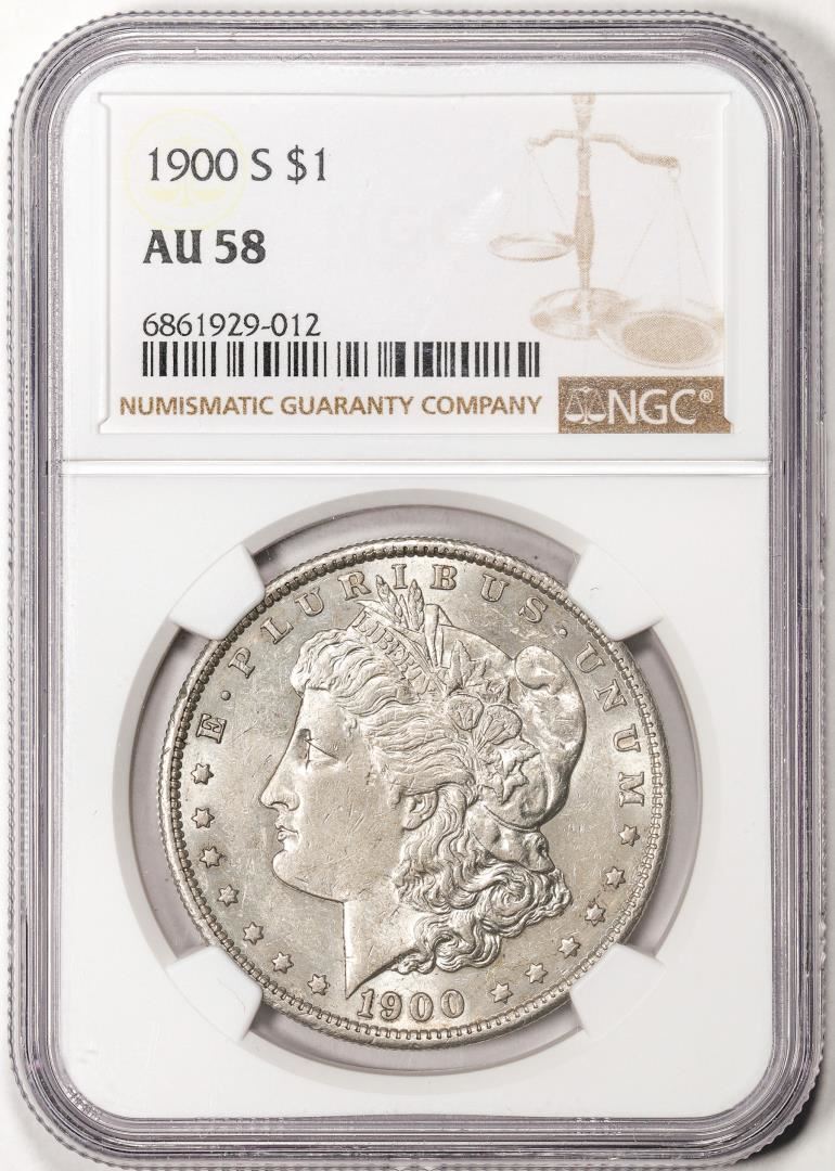 One 1900-S $1 Morgan Silver Dollar Coin NGC AU58. NGC Certified.