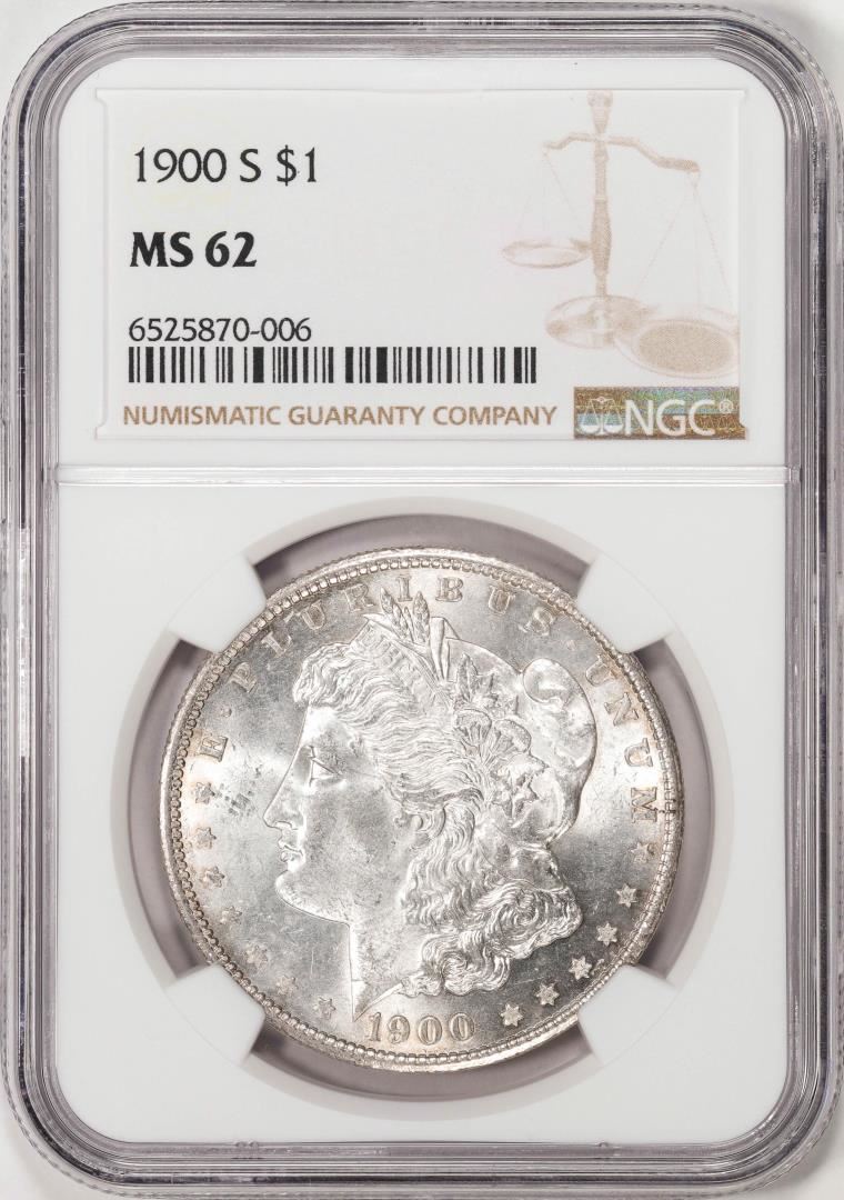 One 1900-S $1 Morgan Silver Dollar Coin NGC MS62. NGC Certified.