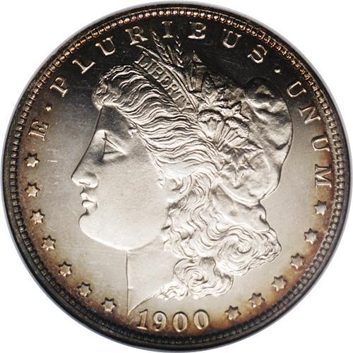 <B>1900<img border='0' src='http://www.heritagecoins.com/images/star.gif' width=10 height=10>$1> PR66 Cameo NGC.</B></I> Remarkably flashy for this turn-of-the-century issue, with noteworthy field-to-device contrast and beautiful orange-gold peripheral toning. The strike is less than complete over Liberty's ear, a rather trivial critique on this breathtaking Premium Gem specimen. Census: 8 in 66, 18 finer (4/06).