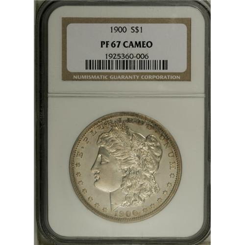 <B>1900 S$1 PR67 Cameo NGC.</B></I> The somewhat larger mintage of this issue, 912 proofs, from 846 in 1899 and 735 in 1898, is undoubtedly due to the centennial change. But in Superb Gem proof condition with Cameo surfaces, as here, the issue is still quite rare and elusive. Only 13 pieces at both NGC and PCGS combined have attained so fine a grade, with six pieces finer, all at NGC (11/06). A light golden cast is visible over the silvery surfaces, while a slight but sufficient amount of mint frost coats the devices. Glimpses of lilac and ice-blue also appear near the rims, and even close scrutiny with a loupe reveals essentially pristine, distraction-free surfaces.<BR><BR><b>Shipping:</b> Coin/Currency (<a target="_blank" href="http://www.heritageauctions.com/common/shipping.php">view shipping information</a>)