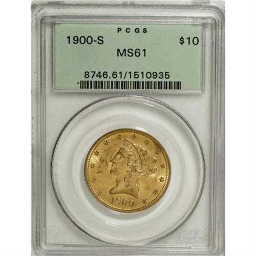 <B>1900-S $10 MS61 PCGS.</B></I> PCGS Population (19/45). NGC Census: (19/18). Mintage: 81,000. Numismedia Wsl. Price for NGC/PCGS coin in MS61: $900. (#8746)<BR><BR><B>Coin Engraver:</B> Christian Gobrecht<BR><BR><b>Shipping:</b> Coins & Currency (<a target="_blank" href="http://www.heritageauctions.com/common/shipping.php">view shipping information</a>)