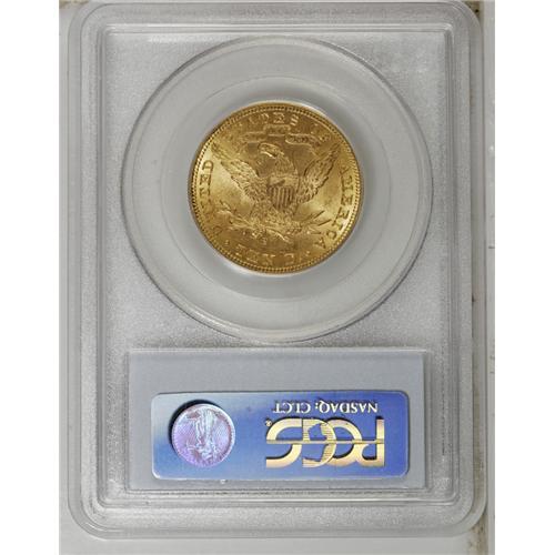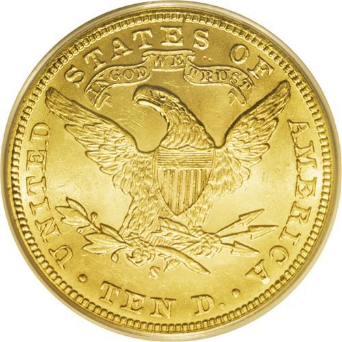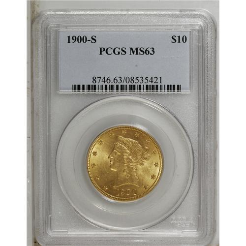 <B>1900-S<$10> MS63 PCGS.</B></I> Despite its proximity to the common 1901-S, the 1900-S is scarce in Uncirculated grades, and an important rarity at the Select level. Only 81,000 pieces were struck, and given the number of pieces certified in XF and AU, most examples were placed in West Coast circulation rather than set aside as bank reserves. The present lustrous and attentively struck representative is refreshingly smooth aside from a couple of concealed marks on the shield. Population: 12 in 63, 2 finer (9/06).