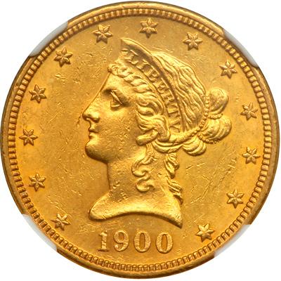 1900-S NGC graded Unc Details. Improperly cleaned. Only 81,000 pieces struck of which merely 800 are estimated to have survived. Marvelous intense golden orange toning is evident on both sides (PCGS # 8746) .