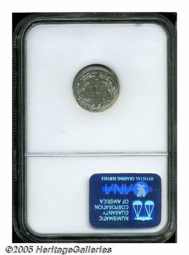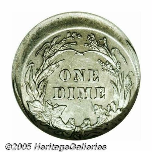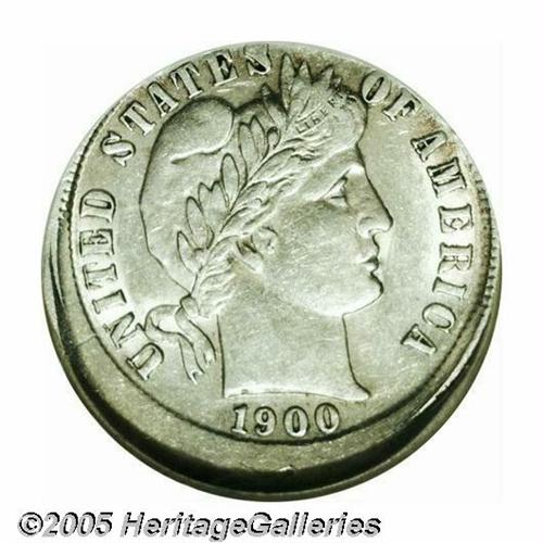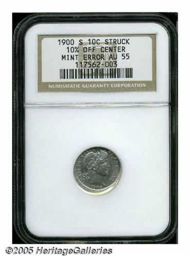 <B>1900-S<10C> Barber Dime--Struck 10% Off Center--AU55 NGC.</B></I> Moderately off center toward 1 o'clock, this partly lustrous branch mint Dime has delicate pearl-gray color and chestnut color. The base of the mintmark is tight against the flan, but the legends and devices are generally intact. The sole handling mark is located on the unstruck portion beneath the date.