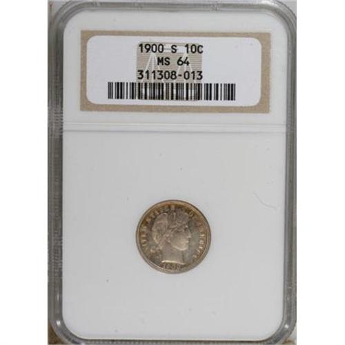 <B>1900-S 10C MS64 NGC.</B></I> Sharply struck with prooflike fields and attractive light coral toning on the obverse. Deeper purple-rose, cobalt-blue and gold coloration adorns the reverse, where faint grease streaks (as made) extend diagonally beneath ONE DIME. A desirable near-Gem example of this popular turn-of-the-century issue. Census: 23 in 64, 14 finer (6/07). <BR><BR><b>Shipping:</b> Coins & Currency (<a target="_blank" href="http://www.heritageauctions.com/common/shipping.php">view shipping information</a>)