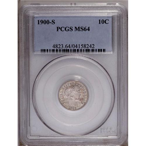 <B>1900-S 10C MS64 PCGS.</B></I> Highly lustrous surfaces are overlain by dappled golden-brown patina on the obverse. The design elements are sharply struck, and a few minor ticks on Liberty's cheek limit the grade. Population: 26 in 64, 18 finer (12/05).