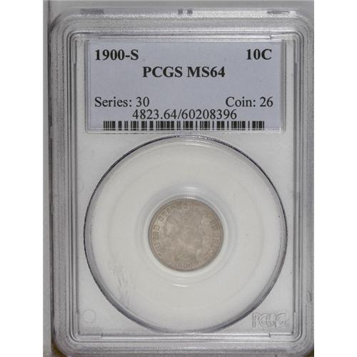 <B>1900-S<10C> MS64 PCGS.</B></I> This unabraded near-Gem is struck with pinpoint sharpness, and has a deep blanket of gunmetal-gray toning on the obverse. The light golden-brown reverse displays vivacious luster. Population: 27 in 64, 18 finer (1/06).
